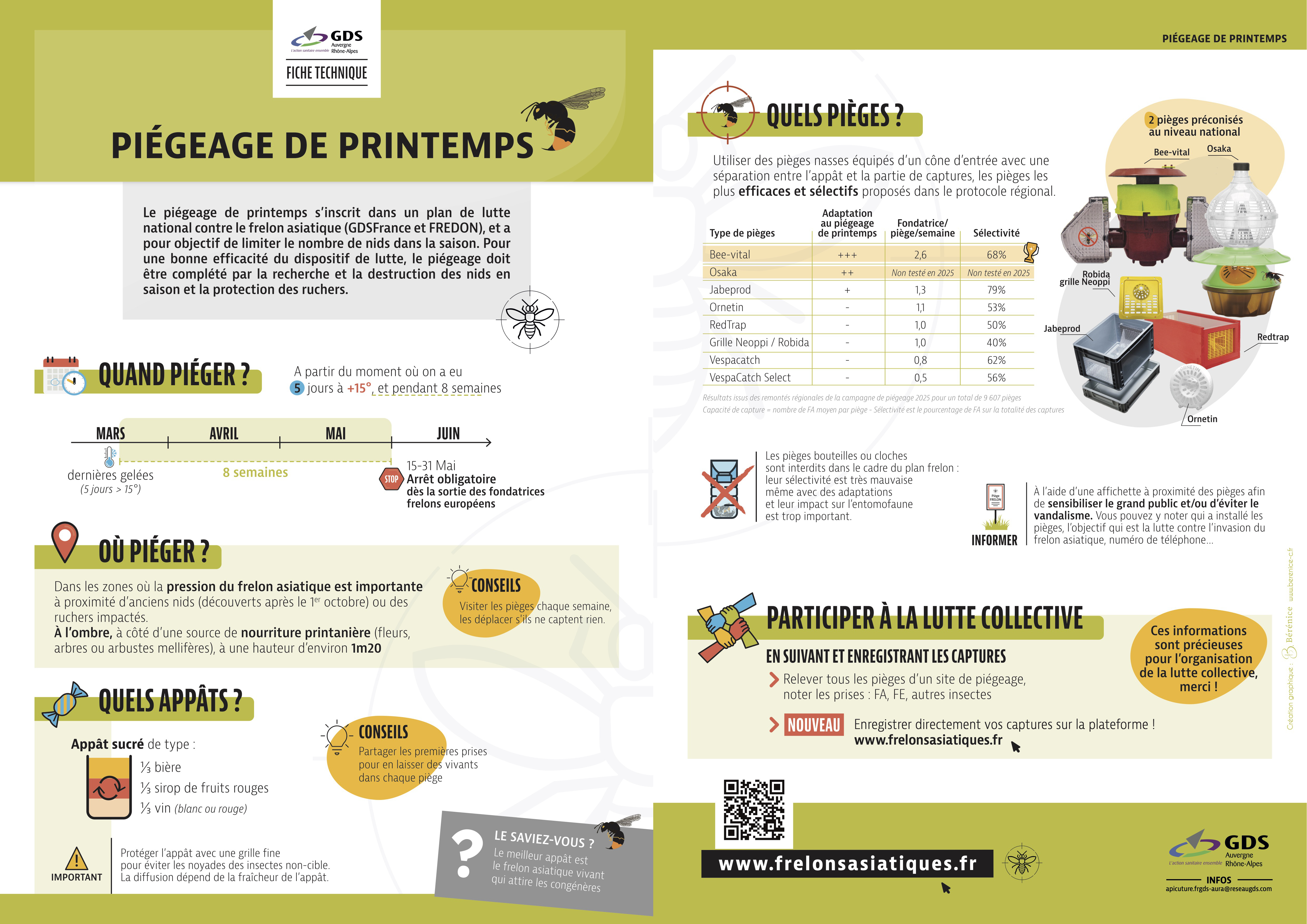 L'objectif est de piéger les fondatrices dès leur sortie aux premiers beaux jours au printemps (fin février). Le piège doit être attractif pour le frelon asiatique mais sélectif pour ne pas piéger les autres insectes (abeilles, frelons européens...)